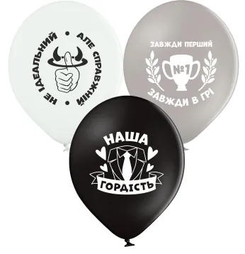 Комплект латексних повітряних кульок з надихаючими написами для чоловіків. Кольори і написи у випадковому співвідношенні. Виробник куль – Белбал (Польща). Відмінно літають із гелієм.